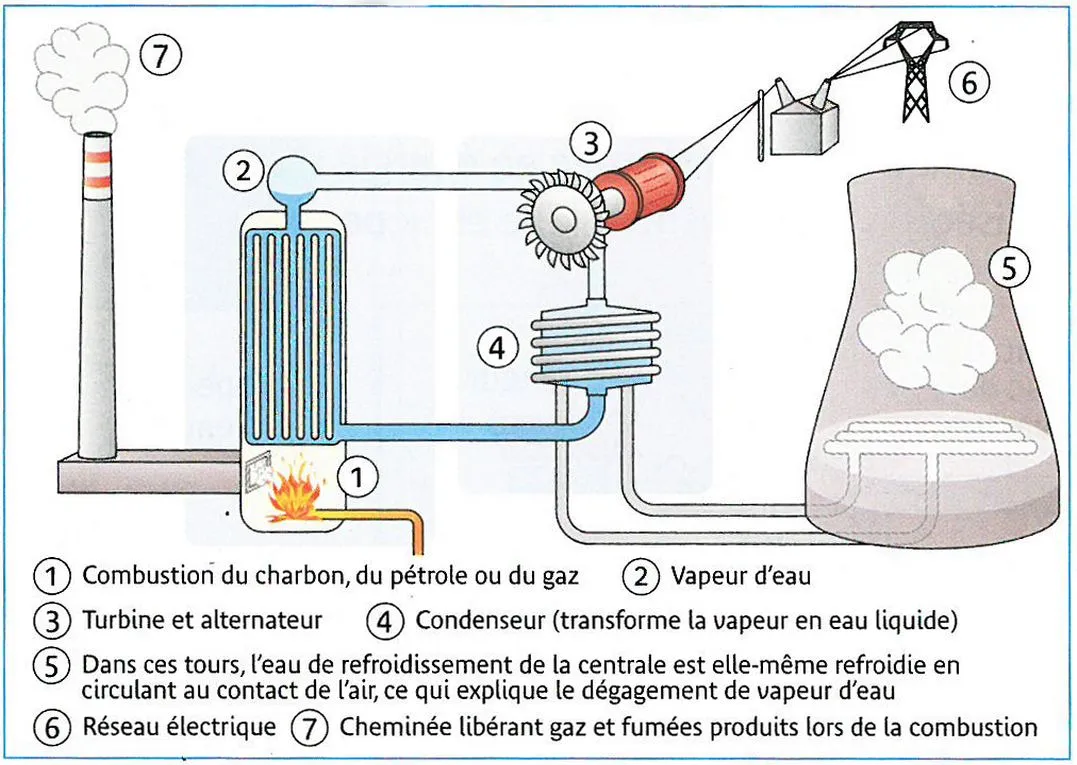 Exemples : Centrale à charbon, à pétrole, à gaz ou centrale nucléaire..