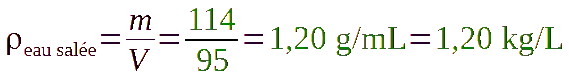 Il y a donc 1,20- 1= 0,20 kg/L de sel dans l’eau