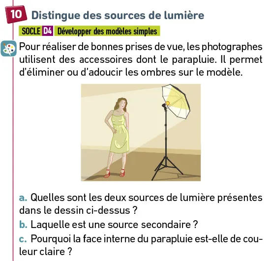 On reprend l’expérience précédente en insérant un objet opaque entre la source primaire et la figurine à observer. Puis on dispose successivement plusieurs feuilles (blanche, noire et colorée) au-dessus du montage.